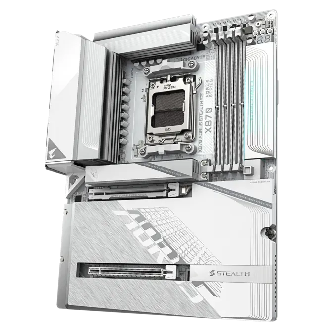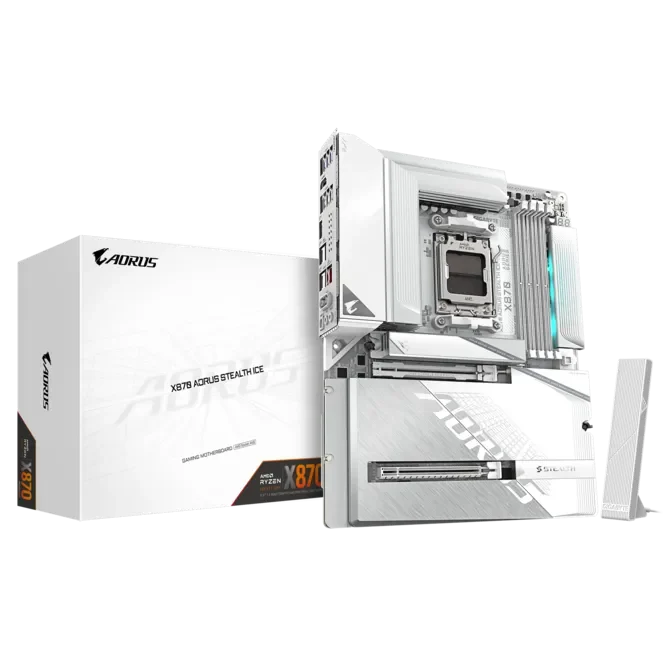 La AORUS X870 STEALTH ICE WIFI 7 est une carte mère haut de gamme conçue pour les configurations modernes alliant puissance, innovation et design premium. Basée sur le chipset X870, elle prend en charge les derniers processeurs AMD Ryzen ainsi que la mémoire DDR5, offrant des performances rapides et une excellente réactivité. Son design STEALTH ICE se distingue par une esthétique entièrement blanche et une connectique dissimulée à l’arrière, garantissant un montage propre, sans câbles visibles, idéal pour les PC élégants et vitrés. Elle intègre le PCIe 5.0 pour les cartes graphiques et SSD nouvelle génération, assurant des vitesses maximales et une évolutivité durable. Côté connectivité, elle embarque le Wi-Fi 7 pour des connexions sans fil ultra-rapides et stables, ainsi que des ports USB haute vitesse et des solutions réseau avancées. Son système d’alimentation robuste et son refroidissement optimisé assurent une stabilité parfaite même sous forte charge. La AORUS X870 STEALTH ICE WIFI 7 est le choix idéal pour les utilisateurs recherchant une carte mère performante, futuriste et au design épuré.