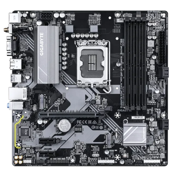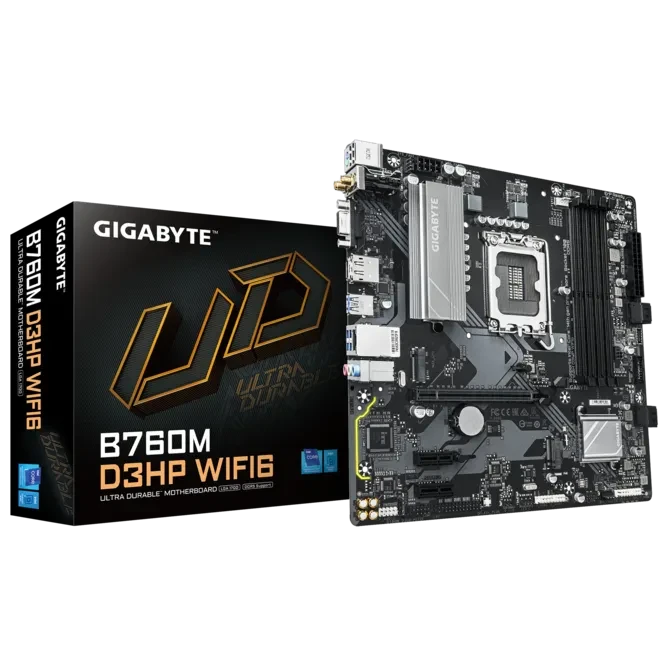 La Gigabyte B760M D3HP WIFI6 est une carte mère Micro‑ATX basée sur le chipset Intel B760 pour processeurs Intel Core de 12e à 14e génération. Elle supporte la mémoire DDR5 en Dual Channel et offre des interfaces modernes comme Wi‑Fi 6, Bluetooth 5.3 et LAN Gigabit.