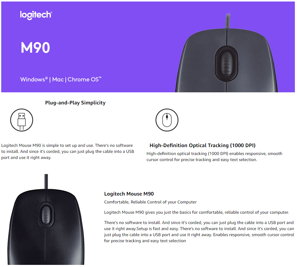 Juste l'essentiel Avec la souris Logitech Mouse M90, allez à l'essentiel en matière de confort et de fiabilité. Fabriquée par Logitech, le spécialiste des souris, cette souris bénéficie de toute l'expertise d'un fabricant ayant produit plus d'un milliard de souris. De conception filaire, il vous suffit de connecter le câble à un port USB pour pouvoir l'utiliser quant à sa forme de taille standard, adaptée à la main droite comme à la main gauche, permet de positionner votre main confortablement, alors que le suivi optique haute définition (1 000 dpi) vous garantit un contrôle réactif et fluide du pointeur, permettant un suivi précis et une sélection de texte aisée.
